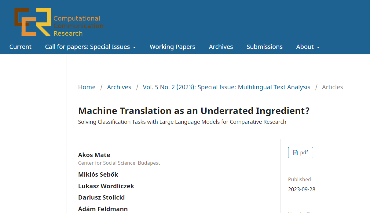 The journal article by Ákos Máté, Miklós Sebők, Lukasz Wordliczek, Dariusz Stolicki and Ádám Feldmann has been published in Computational Communication Research on September 28, 2023, entitled "Machine Translation as an Underrated Ingredient? - Solving Classification Tasks with Large Language Models for Comparative Research."